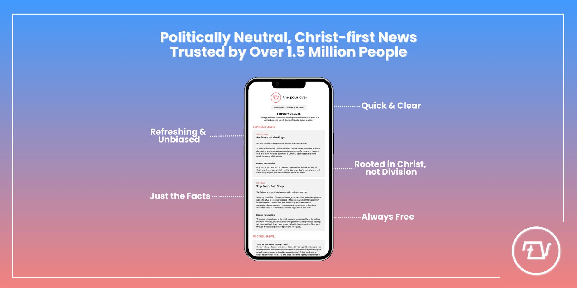 Every Monday, Wednesday, and Friday, they deliver quick, entertaining news summaries paired with short biblical reminders to keep you rooted in Christ, not the chaos. Instead of fueling division, the news becomes a tool to strengthen your faith and spark loving action in response.
